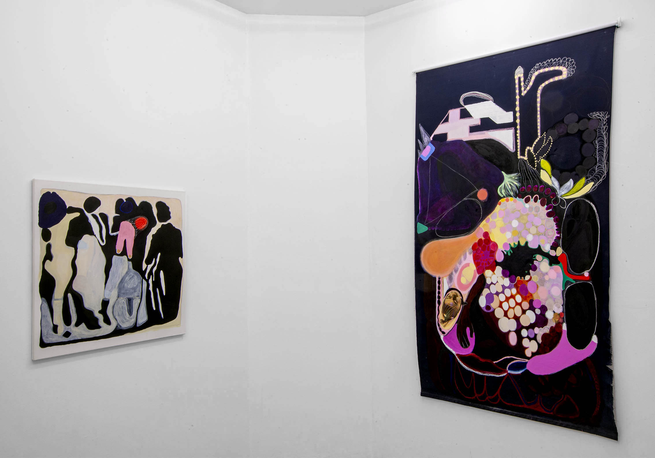 Onkel Vanja, Sonja, Lilla Sputnik, acrylic on canvas, 2021 , Right: Leviathan, acrylic, pastell, chalk on window roll-up, 2021